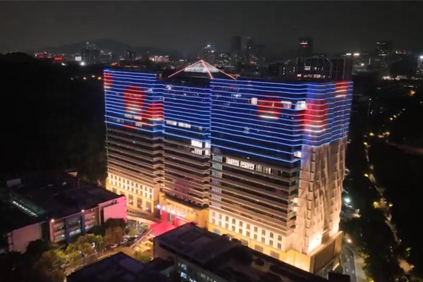 建筑頂部幕墻采用 RGBW 全彩燈光,通過智能控制,以立面動(dòng)態(tài)圖案與定制動(dòng)畫演繹企業(yè)形象,吸引多視角關(guān)注,深化企業(yè)品牌辨識度;控制系統(tǒng)設(shè)置平日、節(jié)假日模式,可根據(jù)不同節(jié)日定制專屬光影內(nèi)容,并與廣場噴泉實(shí)現(xiàn)光影聯(lián)動(dòng),營造不同的場景氛圍。樓身則以大功率燈光做整體烘托,通過光影塑造建筑體量,強(qiáng)化空間視覺存在感。